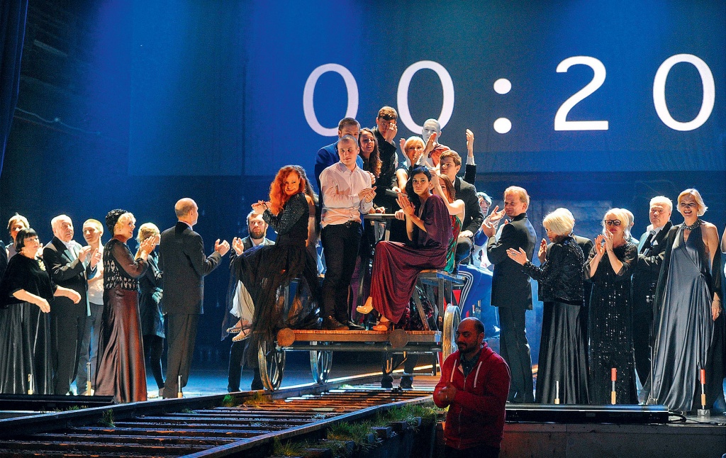 В финале торжественного открытия «Гоголь-центра» над гудящей от возбуждения железной дорогой, проложенной через зал на сцену, взмывали под купол театра белые голуби, а затем на огромном железнодорожном табло начинался отсчет времени, нового времени — от четырех нулей.