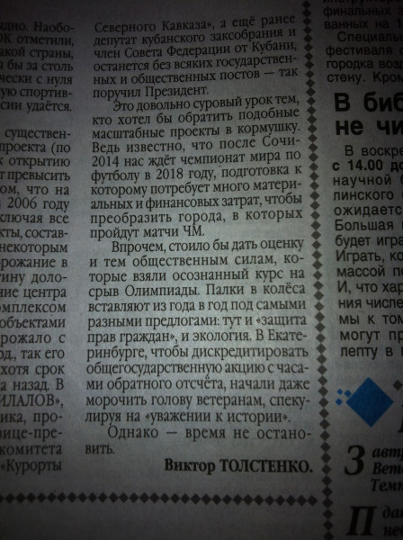 И тут высоким слогом: "Стоило бы дать оценку и тем общественным силам, которые взяли осознанный курс на срыв Олимпиады". Оказывается, палки в колеса вставляют (неназванные) силы под предлогами "защиты прав граждан" (в кавычках!), "уважения к истории" (в кавычках!) и экологии (почему-то без кавычек).