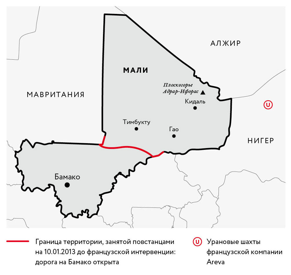Малийская армия была неспособна остановить исламистов, но и французы, придя на помощь, вовсе не бескорыстны — это вам скажет любой малиец. Здесь многие помнят заявления французского президента Франсуа Олланда в сентябре 2012 года: «Африканские дела должны решать африканцы». Франция тогда отрицала любую возможность отправки своего контингента, опасаясь за судьбу девятерых заложников-французов, которые вот уже несколько месяцев содержатся где-то в Сахаре. Но о заложниках тут же забыли, когда исламисты заняли 10 января города Кона и Диабали, дорога на столицу была открыта, а на севере повстанцы стали угрожать урановым шахтам, разрабатываемым французской компанией Areva в соседнем Нигере. Парижу потребовалось меньше суток, чтобы перебросить первые отряды спецназа и начать операцию «Серваль».