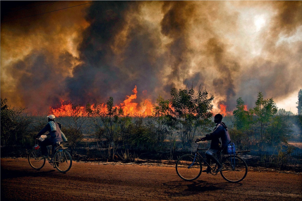 Лесной пожар вдоль дороги на север после налета французских истребителей