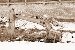 Когда я в воскресенье 10 февраля фотографировал экскаватор, проходящие мимо туристы, прежде всего, обращали внимание именно на провалившуюся землеройную технику, а потом уж – на крепостные стены и башни.
