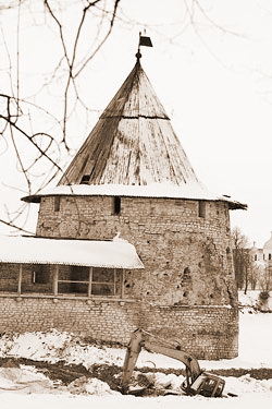 Любители псковской старины до сих пор обсуждают: что должно быть между Плоской и Высокой башней? В смысле, надо ли восстанавливать исторические решётки? Эти решётки в средневековье опускались при приближении врага.