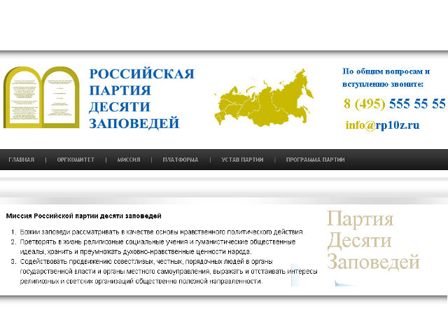 В минувшее воскресенье в Москве состоялся учредительный съезд Российской партии десяти заповедей. В нем приняли участие 134 делегата от 45 субъектов РФ, представляющих христиан разных конфессий, мусульман и иудеев. Возглавил руководящий орган партии - политический совет - доктор философских наук Сергей Мезенцев.