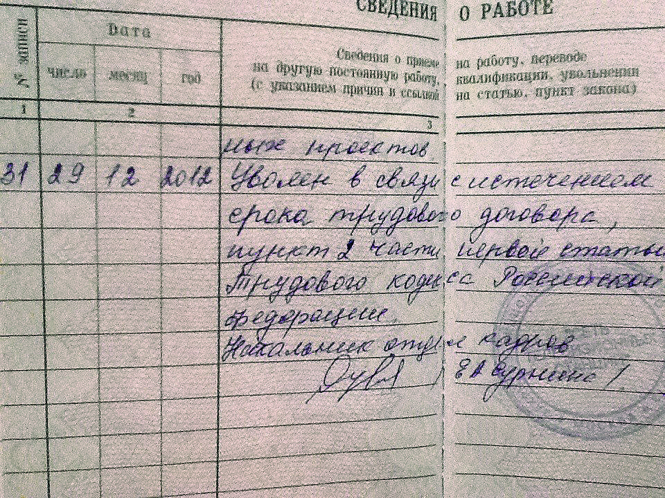 Как сказать… Первый намек последовал в середине декабря, может быть, за две с половиной недели до произошедшего. Нет, мне никто не сказал: «Мы тебя увольняем» — речь шла о переводе в другую структуру. И я полагал, что в начале января (2013-го) это все и произойдет. Поэтому, когда 28 декабря (2012 года) я появился на работе и меня попросили зайти в отдел кадров, где протянули мою трудовую книжку с записью «уволен в связи с истечением контракта», для меня это было, честно говоря, неожиданно.