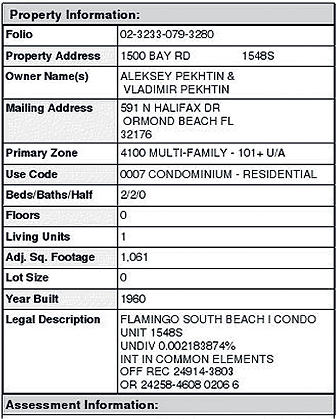 | Нажмите, чтобы увеличить картинку Свидетельство о собственности на кондоминиум в доме на Flamingo South Beach, Флорида, США, выданное Алексею Пехтину и Владимиру Пехтину. Рыночная цена квартиры $238,636 |