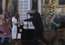 Выступление продолжается около минуты. Активисток в балаклавах оттаскивают от алтаря, и они бегут к выходу. Один прихожанин хватает девушку за волосы, но она вырывается. Девушки выбегают из храма, на ходу снимая с себя балаклавы. Я выбегаю за ними. Позднее я узнаю, что охранники задержали и сдали полиции съемочную группу то ли французских, то ли немецких документалистов и российскую журналистку. Потери небольшие - я боялся, что из храма вообще никому не дадут выйти.
