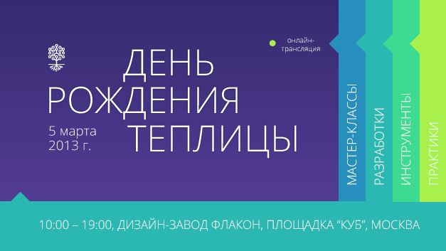 5 марта 2013, 10:00 – 19:00, дизайн-завод «Флакон» (Москва). Теплица социальных технологий приглашает на свой день рождения: нам исполнился год! И отметить это событие мы хотим по-особому: мы организуем целый день мастер-классов на темы, связанные с информационными технологиями для гражданского сектора, о которых мы писали и над которыми работали в течение прошедшего года. В программе возможны изменения