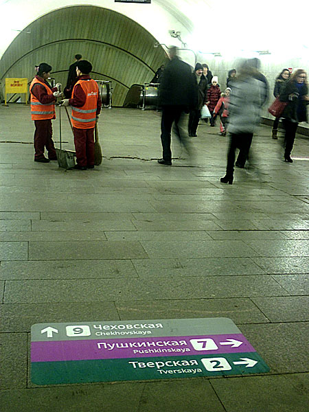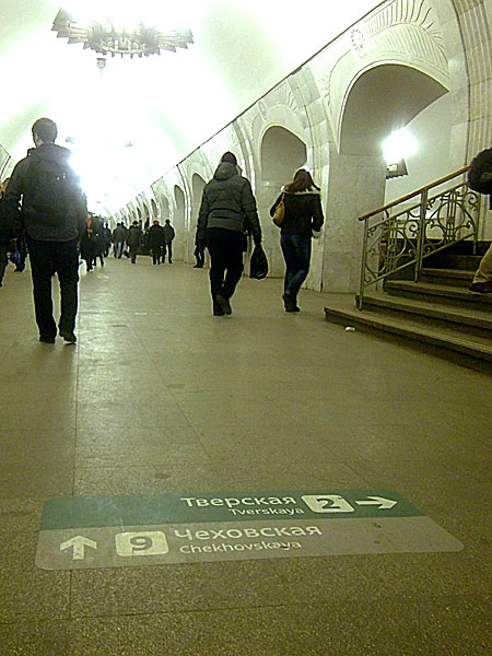 21 февраля, в первый день после окончания монтажных работ по установке напольной навигации на транспортном узле Московского метрополитена «Чеховская-Тверская-Пушкинская». Корреспондент «Полит.ру» сходил посмотреть, помогают ли новые указатели пассажирам.