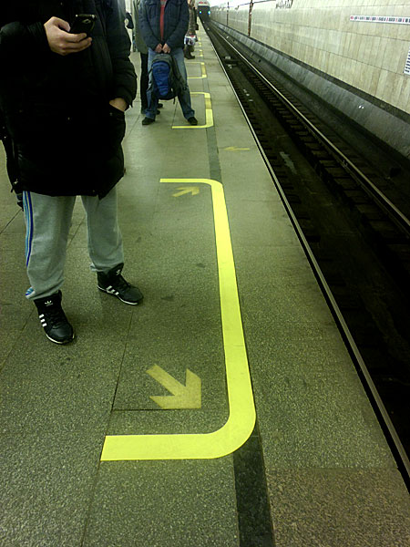 Отметки, которые подсказывают пассажирам, где надо встать для успешного захвата сидячих мест посадки на поезд, выполнены желтым цветом. «Задержка одного поезда задерживает и следом идущие. Каждая секунда суммарно дает результат. Идут лишние остановки. Поезда следом выбиваются из графика, расходуется лишняя электроэнергия», – рассказал Дмитрий Бузанов о проблемах, которые сейчас создают пассажиры, задерживающие отправление поезда. По его словам, в других странах разметка помогает.