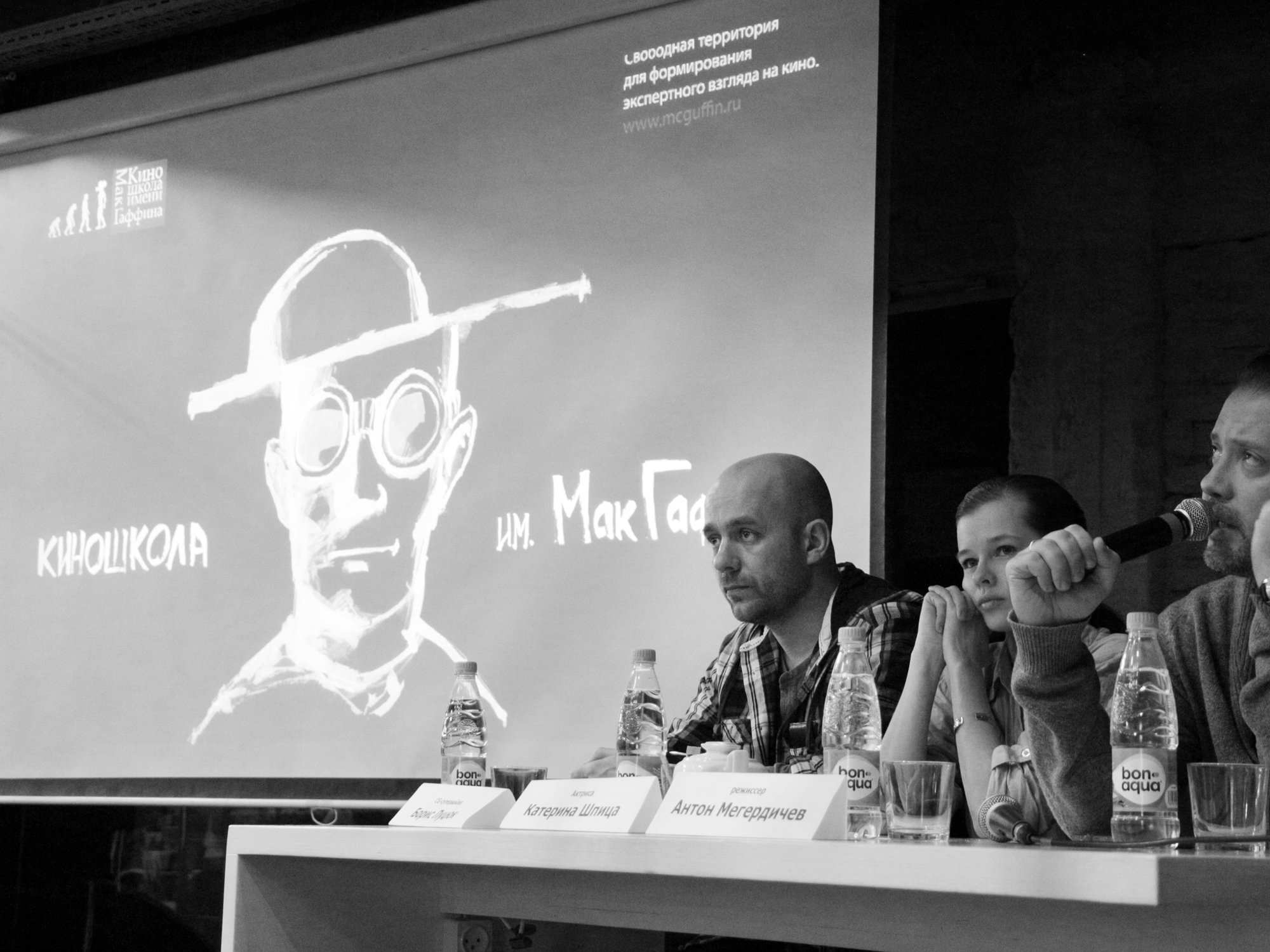 Дарья: Впервые Киношкола им. МакГаффина приглашает создателей блокбастера. Обычно мы говорим о документальном или авторском российском кинематографе. Мы следим за проектом «Метро» два года, и я рада приветствовать людей, которые могут не спать и работать два года без выходных и праздников, могут не видеть собственную семью ради того, чтобы потом выдавать в конце феномен под названием «российский блокбастер». И конечно, Антон, поздравляем Вас с Днем рождения дочери!