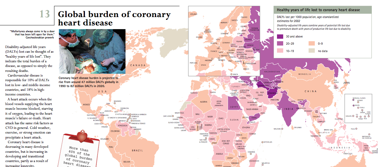 Ишемическая болезнь сердца является одной из главных причин преждевременной смерти в развитых странах, а в развивающихся сердечнососудистые заболевания отнимают в совокупности 30 лет жизни на 1000 человек. Тяжелые несоразмерные нагрузки, холодная погода и эмоциональные переживания могут способствовать сердечному приступу, так же как и резкое изменение стиля жизни, повышение степени урбанизации. Приведенная ниже инфографика показывает статистику заболевания на 2002 год. Хотя данные и не очень свежие, они отражают главные тенденции заболевания, важнейшей медицинской проблемы XXI века.