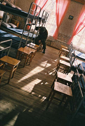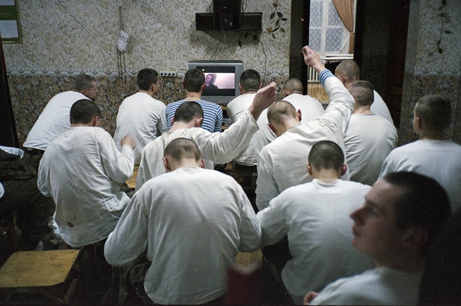 © Александр Михалкович «Рота, рассаживайся для просмотра программы "Панорама"» — ежевечерняя команда из устава воинской службы, которая звучит ровно в 21.00 во всех частях. «Панорама» — пропагандистская программа официального телевидения. Когда офицеров нет в казарме, солдаты предпочитают включить какой-нибудь боевик вместо Геббельс-ТВ. Табуретки выстраиваются стройными рядами. По рассадке военнослужащих и их стрижкам легко определяется армейская иерархия. У самого телевизора сидят «деды», потом «слоны» (военнослужащие второго периода службы) и далее «ганцы» — молодые солдаты первого периода службы. За время просмотра «Панорамы» солдатам необходимо подшить новые подворотнички — архаизм со времен СССР, сохранившийся до сих пор из-за того, что форма стирается по желанию солдата. Молодые солдаты часто подшивают воротнички своим «дедам». У солдата слева видно красное пятно на «бобочке» — так называют верхнюю часть зимнего белья. Это след от гниения. Около 60% солдат из-за недостатка витаминов, гигиены и из-за антисанитарии гниют. Непосредственно у данного солдата на спине во время полевого выхода выскочил прыщ, который растерся от контакта с рюкзаком. Через неделю полевых условий прыщ превратился в чирей. В лазарет солдата не пустили, чтобы не портить статистику роты. Командиры решили сами удалить чирей. Положили солдата на стол, шапку в зубы, армейский нож простерилизовали огнем и удалили. В итоге у солдата через неделю температура 40. Но его все равно не пускают в лазарет и лечат от простуды, отправляют в наряды. Когда его все же отвели в лазарет, там приняли решение о срочной госпитализации. Как потом оказалось, у солдата — заражение крови с осложнением на сердце…