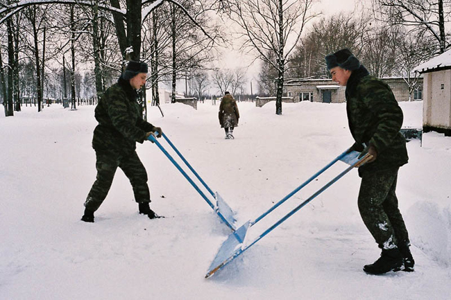 © Александр Михалкович Чистка закрепленной за ротой территории — ежедневный воинский долг каждого солдата! Три эти фотографии показывают то, как на самом деле отдает долг Родине большинство солдат. От этой обязанности не освобождены даже солдаты из войск специального назначения. На уборку территории, особенно зимой, тратится до 90% времени военнослужащих. Квадратный снег или покраска-припудривание грязного снега чистым — не архаичный миф, а суровая реальность. Причем чем ближе закрепленная территория к штабу, тем абсурднее конструкции из снега. Инструмент для уборки в армии имеет свое название. Например, эти огромные конструкции из досок ласково зовут «машками». Для уборки плаца есть металлическая «мегамашка», в которую, как в плуг, впрягаются одновременно 6 солдат.