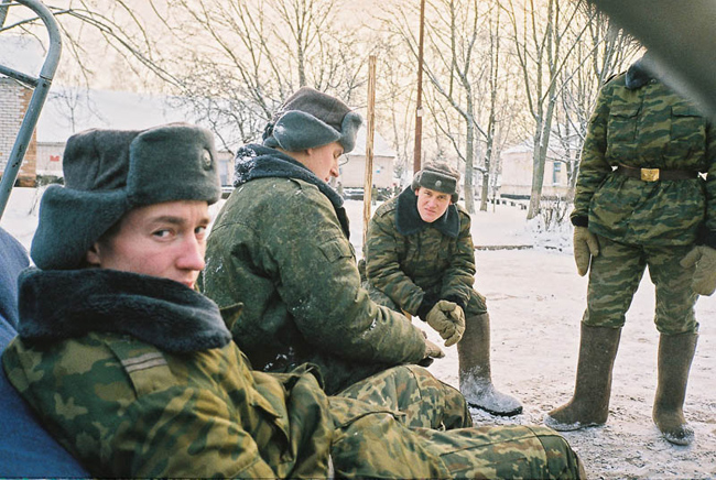 © Александр Михалкович Солдаты, занятые на ежедневной уборке снега, присели отдохнуть.