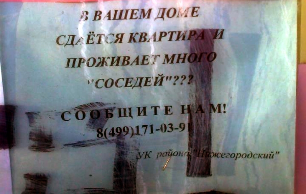 В ДЕЗе Капотня вопрос о выявлении живущих не по прописке был встречен с оптимизмом: "У нас ведется работа по выявлению нелегалов, тех, кто живет не по прописке. Местные жители реагируют на проверку положительно, помогают даже. Письменных заявлений от них нет, больше сообщают в устной форме".
