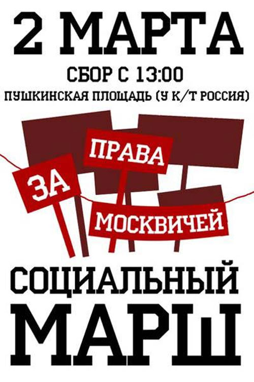 В субботу, 2 марта, в столице состоится "Марш за права москвичей". Сбор в 13:00 на Пушкинской площади за кинотеатром "Россия". Участники марша пройдут по бульварам до проспекта Сахарова. Основной инициатор "Социального марша" - Сергей Удальцов. Сам он не сможет принять участие в акции, поскольку помещен под домашний арест.
