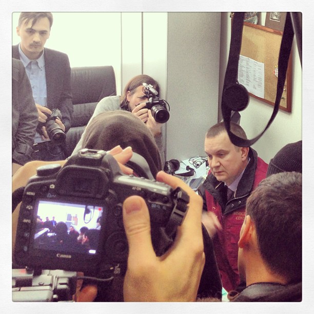 "Московские процессы" прерваны во время слушания свидетелей по делу Pussy Riot. Явилось четыре человека из иммиграционной службы ФМС и проверяют документы у режиссера проекта Milo Rau. У него 3-месячная рабочая виза. Сейчас представители ФМС, журналисты и участники проекта в кабинете Сергея Лукашевского. У входа в Сахаровский центр стоит Энтео с баллончиком краски и черным флагом.
