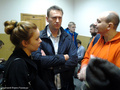 Кривов очень худ после голодовки. "Телесную плотность потерял, раньше был очень мускулистый, спортивный", - горюет жена Кира. Андрей Барабанов сохранил свою очаровательную улыбку, подмигивает друзьям и корчит рожицы. Сияет свежестью и очарованием Саша Духанина, хотя также бледна (пусть и дома, но без свежего воздуха). Двое мужчин-адвокатов рядом с ней, как рыцари, охраняющие от злых сил. Кажется, они сами так чувствуют. Но уже через полчаса она оказывается в плену совсем других воинов - приставов.