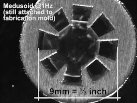 Робот-медуза Видео: Caltech/Harvard University Сразу несколько моделей водоплавающих роботов собраны по подобию медуз. Например, конструкторы из Университета Техаса (США) представили прототип с силиконовым куполом и металлическими кольцевыми «мышцами», который работает на водороде. Другая группа американских исследователей из Гарвардского университета пошла еще дальше: их роботизированная медуза приводится в движение за счет сокращения сердечных клеток крысы, встроенных в эластичный купол. При пропускании через морскую воду слабого электрического тока эти клетки сокращались, выталкивая воду и приводя устройство в движение. Затем синтетическая оболочка восстанавливала свою форму.