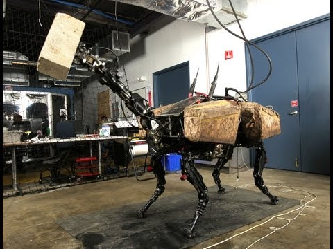 BigDog Видео: Boston Dynamics Например, четвероногая механическая собака BigDog способна передвигаться по пересеченной местности, взбираться на крутые склоны и при этом переносить до 55 килограммов груза. Усовершенствованная версия, получившая название «Шагающая система поддержки отряда» или LS3, может следовать по заданному маршруту с помощью GPS, сканировать окружающую местность и нести на себе 400 килограммов снаряжения. При этом несколько роботизированных «мулов» могут выстраиваться в колонну и, следуя за вожаком, доставлять снабжение для воинских подразделений.