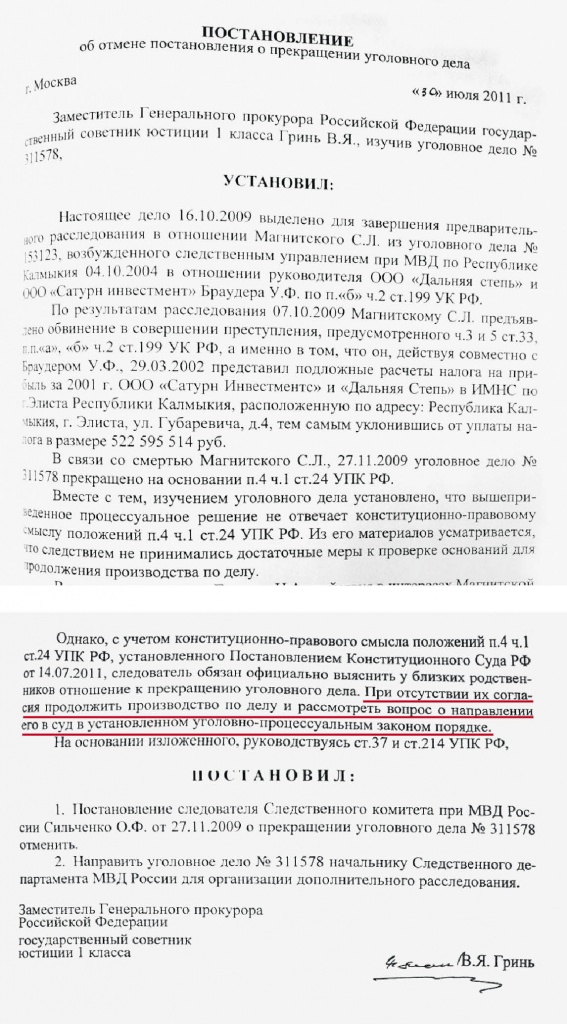 The New Times публикует постановление заместителя генерального прокурора Виктора Гриня, который вопреки воле родственников умершего Магнитского разрешил возобновить следствие, прекращенное после его смерти. По мнению судьи КС в отставке Тамары Морщаковой, это постановление противоречит решению Конституционного суда, который разрешил проводить посмертные процессы только по заявлению родственников для реабилитации честного имени обвиняемого.