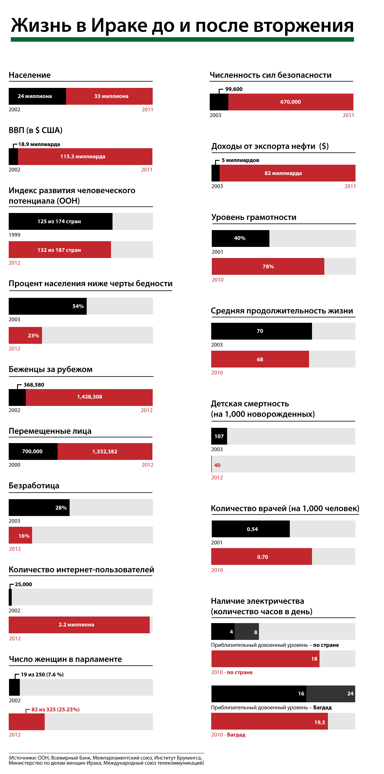 "Если посмотреть на реальные цифры и представить себе, что Ирак вернется к довоенным показателям добычи нефти – 3 миллиона баррелей в день, тогда, учитывая сегодняшние цены на нефть, страна будет получать в год от продажи нефти 20-25 миллиардов долларов. Но это всего 1000 долларов на человека. Эти деньги не покроют все потребности страны. С моей точки зрения, то, что страна получит в качестве прибыли от продажи нефти, – очень незначительная доля того, что придется потратить на восстановление, особенно в том случае, если это будет затяжная и дорогая война", – ответил профессор.