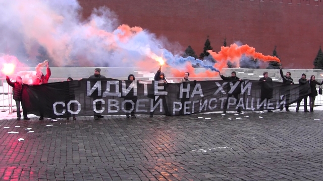 В несогласованной акции против прописки в понедельник приняли участие около десятка гражданских активистов. У мавзолея они зажгли файеры, развернули баннер "Идите на хуй со своей регистрацией" и скандировали "Где живем - не ваше сучье дело", "Путин будет казнен", "Долой власть чекистов", "Это наша страна".