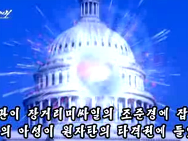 Воображаемую атаку закадровый голос комментирует: "Белый дом находится под прицелом наших ракет дальнего действия, а столица войны - в зоне досягаемости нашей атомной бомбы". Как сообщили эксперты CNN, на самом деле КНДР таким оружием не располагает и на его разработку у оплота социализма уйдет много лет.
