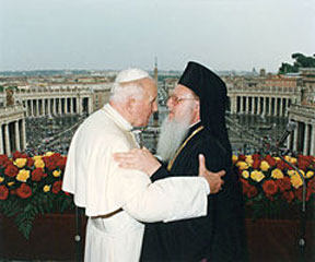Инок Афанасий В диалоге на радио «Вести FM» с В. Соловьевым радикальный «афонский инок Афанасий» громко объявлял пап Рима еретиками и сатанистами. Встречу же - прискорбной новостью. На самом деле, никакой новизны и сенсации во встрече патриарха Варфоломея и папы Франциска нет. В отличие от российских СМИ, зарубежные медиа не придают подобным событиям никакого сакрального значения, а сами встречи константинопольского первоиерарха и римского понтифика уже давно стали заурядными событиями европейской политической жизни. Это уже четвертый визит патриарха Варфоломея непосредственно в Ватикан, не считая многочисленных рядовых визитов в Италию. Первый раз он побывал здесь в 1995 году, а уже в 2004 папа Иоанн Павел II заявил, что эти встречи стали «символом желанного примирения между Католической и Православными Церквами, а также предчувствием надежды на продвижение к полному единству всех христиан». Перед тем, как сказать эти слова, в качестве жеста доброй воли Иоанн Павел II подарил константинопольскому патриархату здание римской церкви св. Феодора. С той поры, пребывая в Рим, патриарх Варфоломей возносит в этой церкви молитвы за здравие самого понтифика.