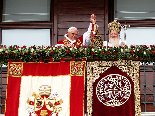 Папа Бенедикт XVI и патриарх Варфоломей Фото: platos-academy.com Когда СМИ сообщили о том, что вселенский (константинопольский) патриарх Варфоломей прибудет на интронизацию нового римского понтифика для участия в ней, многие интересующиеся религией и политикой в России посчитали это событие сенсационным. Либеральные обозреватели назвали это событие долгожданным знаком сближения двух ветвей христианской церкви после тысячелетней схизмы. Неоконы же с нескрываемой тревогой заговорили о религиозной и политической экспансии Ватикана, затягивающего в свою орбиту все новые политические и религиозные фигуры православного Востока.