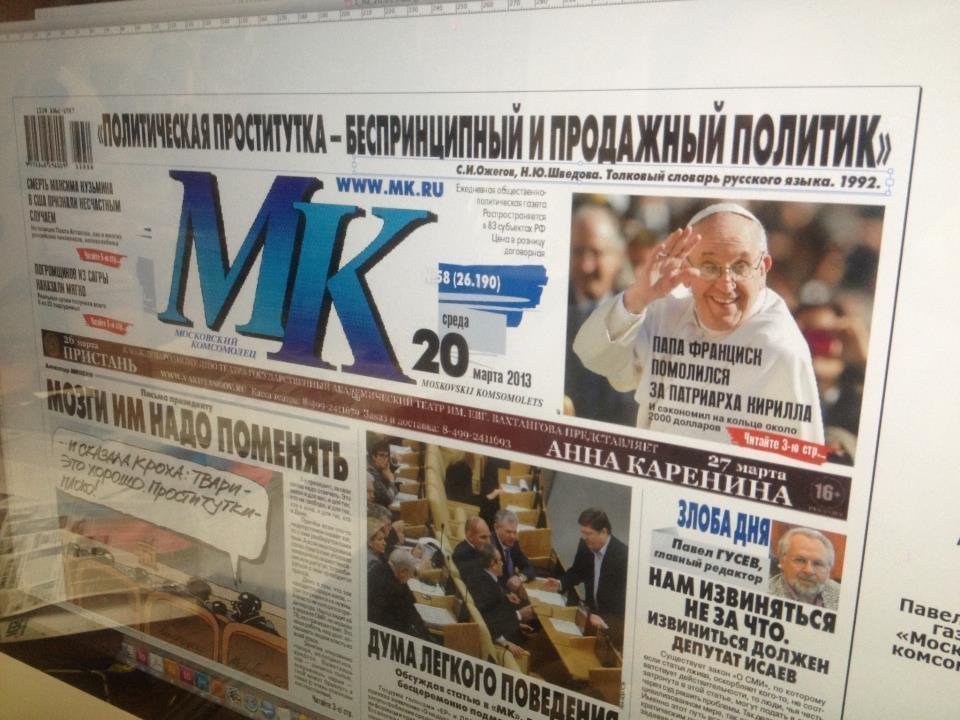 «Политическая проститутка — беспринципный и продажный политик», — говорится в самом верху уже сверстанной первой полосы газеты, фотографию которой у себя в Facebook разместил корреспондент МК Никита Карцев.