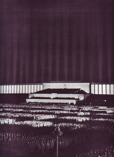 Альберт Шпеер. Освещение главной трибуны поля съездов в Нюрнберге, 1936 Здание в ярком свете солнца, в тусклый осенний день, в сумерки или ночью предстает перед нами в различных обличьях. Когда в окнах горит свет, оно выглядит совсем иначе, нежели когда все окна темны. Когда на улице светятся фонари, оно вновь меняется, разделившись пополам: на освещенный цоколь и темную массу верхних этажей. А если речь идет о небольшом особняке, то в свете фонарей он оказывается как будто в привычном дневном обличье. Можно счесть эти явления естественными в том смысле, что свет, не принадлежащий зданию, внеположный ему, безразличный, и есть тот свет, которому здание должно быть подвержено. В таком случае свет, сочиненный нарочно для здания, неестествен. Но и здесь мы оказываемся в ловушке: если освещение здания сочинено вместе с ним, то этот свет есть часть его архитектурного замысла, и единственный упрек, который можно к такому свету обратить, — отчего зданию нужен иной, неестественный свет? Только лишь чтобы привлечь к нему внимание? Или этот свет призван создать драматический эффект, сопоставимый с эффектами дневного света? Тогда этот упрек становится в единый ряд со всеми прочими вопросами, относящимися к выразительности или декоративности архитектурной формы в широком смысле слова, обсуждение которых — тема отдельного долгого разговора. Свет же, сочиненный для здания, которое принадлежит к эпохе, не знавшей электрического света, неоспоримо неестествен: архитектура здания его заведомо не предполагает. Впрочем, введенная здесь категория «естественности» нисколько не проясняет дела, пусть и позволяет хоть как-то систематизировать освещение зданий. Неясно даже, является ли такая естественность неоспоримым благом или она благо только в глазах консерватора.