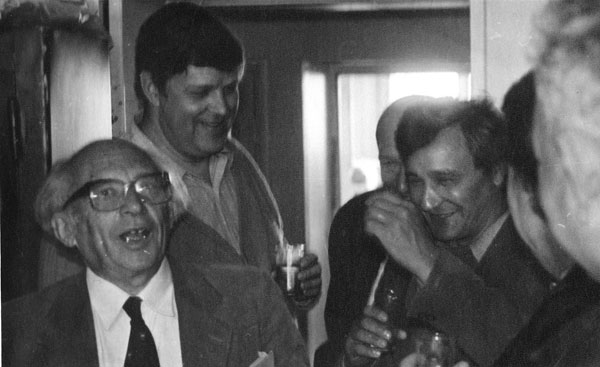 1983 год. Лаборатория И.М.Гельфанда: с Израилем Моисеевичем Гельфандом и Дмитрием Фуксом во время застолья в честь 70-летия Гельфанда