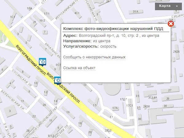 По каждой видеокамере доступна информация о точном месте ее установки, о том, в какую сторону (в область или в центр) она смотрит и какие нарушения фиксирует: превышение максимальной скорости, выезд на выделенку или режим движения грузовиков.