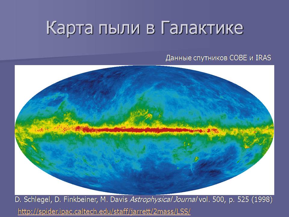 Координаты здесь галактические, то есть экватор соответствует плоскости нашей Галактики. Наша Галактика – большая спиральная структура, картинки сегодня еще будут. И в плоскости этой галактики очень много пыли, мы это видим, но много пыли и дальше. От красного к темно-синему плотность пыли спадает. И это количество пыли, строго говоря, на луче зрения. Когда смог в Москве был, смотрите вдоль земли, там вообще ничего не было видно метров через 100, смотрите повыше - что-то еще видно. Галактика устроена примерно так же. Это самая цитируемая работа. Как это все делалось?
