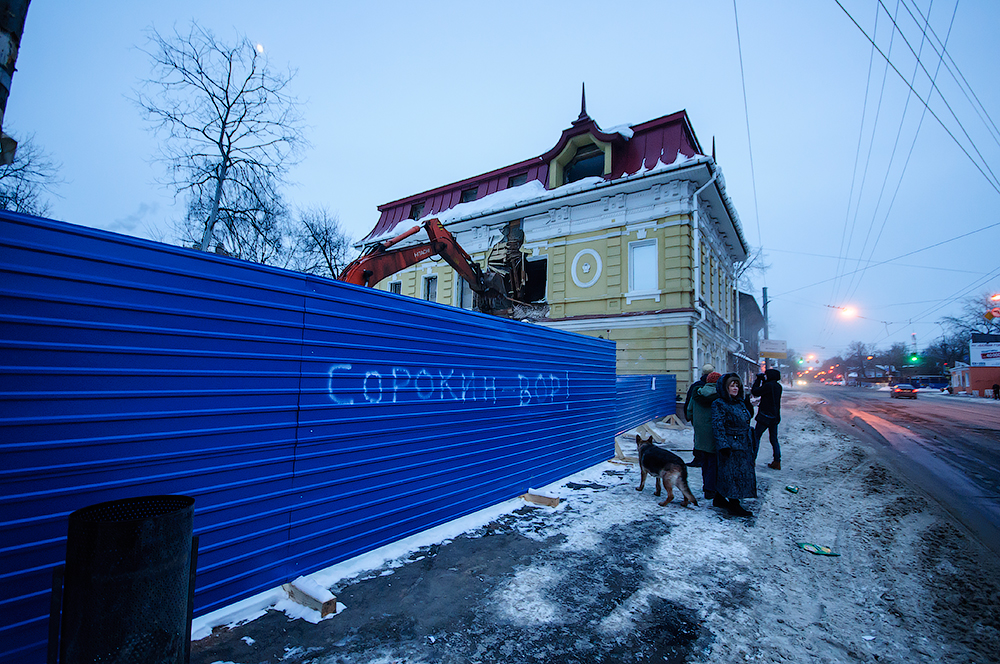 25. "А чего бояться-то? Вот когда мы бояться перестанем, тогда все проблемы можно будет решить. У нас только все толпой могут. Когда каждый по одному не будет бояться, тогда нормально жить можно будет", — именно так утверждал разрушитель-начальник в серой кепке, заняв примирительную позицию и подмазываясь к активистам. До этого он бешено бросался на людей, орал матом. "А давайте не бояться вместе!" — предлагали ему защитники памятника архитектуры.