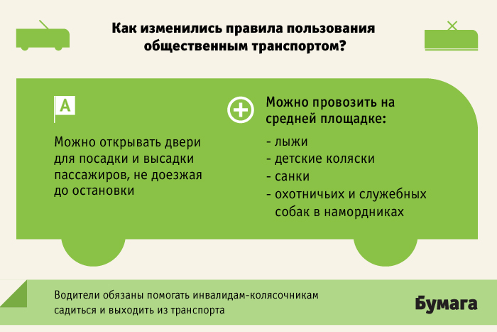 Другое изменение касается остановки транспорта: согласно действующим правилам, водители автобусов, троллейбусов и трамваев были обязаны останавливаться только в специальных местах. Теперь же они имеют право открывать двери, чтобы впустить или выпустить пассажиров, и не доезжая до остановки. Это, однако, не значит, что выходить из автобусов можно будет по требованию. — Скорее всего, имеется в виду расстановка подвижного состава на остановочном пункте. Порядок маршрута сам по себе прописан в уставе автомобильного транспорта. И транспорт, который останавливается в любых незапрещенных местах, называется коммерческим, — уточнил Дмитрий Игнатьев. В общественном транспорте теперь также официально можно будет провозить детские коляски, спортивное снаряжение и крупных собак не только на задней площадке, но и в центре автобуса.