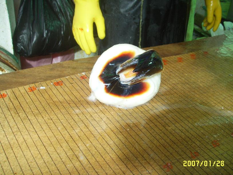 Клюв кальмара, извлеченный из желудка клыкача. Фото Ивана Истомина А.В.: Нападение больших кальмаров на попавшихся на крючок клыкачей - явление не редкое. В некоторых районах Антарктики, где проводится промысел, до 10% пойманных рыб носят следы присосок и ран, нанесенных «клювом» кальмара. Но обычно они отпускают свою жертву еще в глубине, поэтому встречи именно с живыми гигантами очень редки. Но благодаря особенностям биологии кальмара ученые имеют возможность изучать их останки. Дело в том, что эти существа моноцикличные. То есть, достигнув определенного возраста, они приносят потомство и вскоре после этого погибают. После этого их либо выбрасывает на берег, либо они становятся пищей различных морских хищников. Мы часто находили в желудке того же клыкача щупальца длиной до двух метров или куски мантии толщиной в несколько сантиметров.