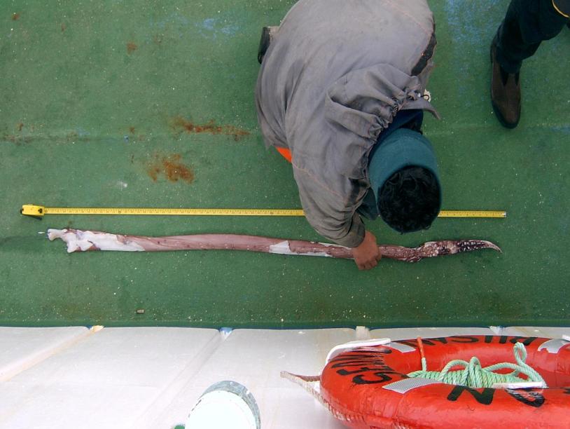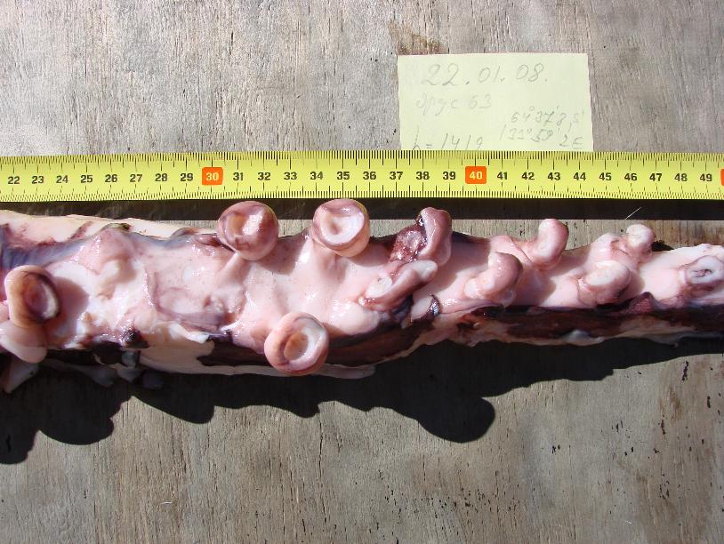 Щупальце колоссального кальмара из желудка клыкача. Фото Ивана Истомина А.В.: Когда рыбу подняли на палубу, мы ее внимательно изучили. Это оказался действительно крупный экземпляр длиной 178 сантиметров и весом 65 килограммов. Сопоставив размеры рыбы и кальмара на фотографии, мы определили, что его мантия имеет около четырех метров в длину и не менее полуметра в диаметре. Общая длина, судя по всему, составляла более пяти метров. Обычно у кальмаров четыре пары коротких щупалец-рук и одна пара длинных ловчих. У нашего экземпляра длинные щупальца были оторваны. Скорее всего, он потерял их в схватке с хищником. До этого его общий размер мог достигать 8-10 метров.