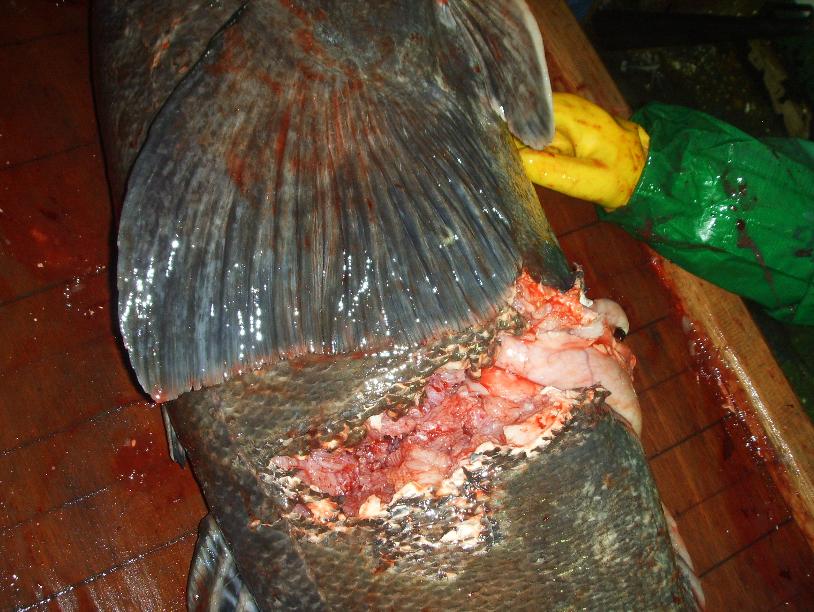 Следы, оставленные кальмаром на клыкаче (Dissostichus mawsoni). Фото Ивана Истомина А.В.: Все тело клыкача было покрыто следами присосок, самые большие из которых достигали трех сантиметров в диаметре. У спинного плавника вырван кусок мяса килограмма на два – три до позвоночника. При этом рыба была еще жива.