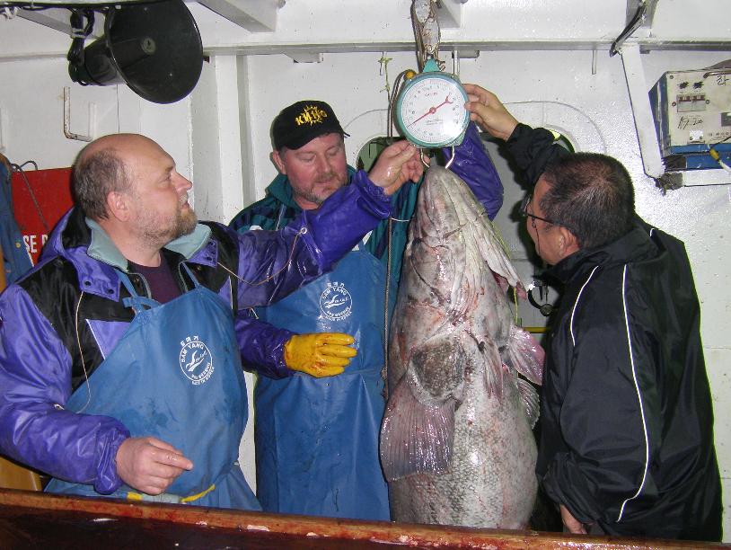 А. Вагин (слева) и И. Истомин (в центре) взвешивают пойманного клыкача Иван Истомин: В тот день мы выбирали ярус, установленный на глубине около полутора километров. В какой-то момент к борту на крючке подошел крупный экземпляр клыкача, тело которого плотно опутал щупальцами огромный кальмар. Он выглядел в несколько раз крупнее своей жертвы и сначала был светлым, а затем сменил цвет на ярко-багровый, как подводная часть нашего судна. По счастливой случайности у меня с собой была камера, и я успел снять это существо. К тому же очень повезло с погодой – солнечные безветренные дни в этих краях бывают не так часто.