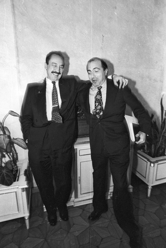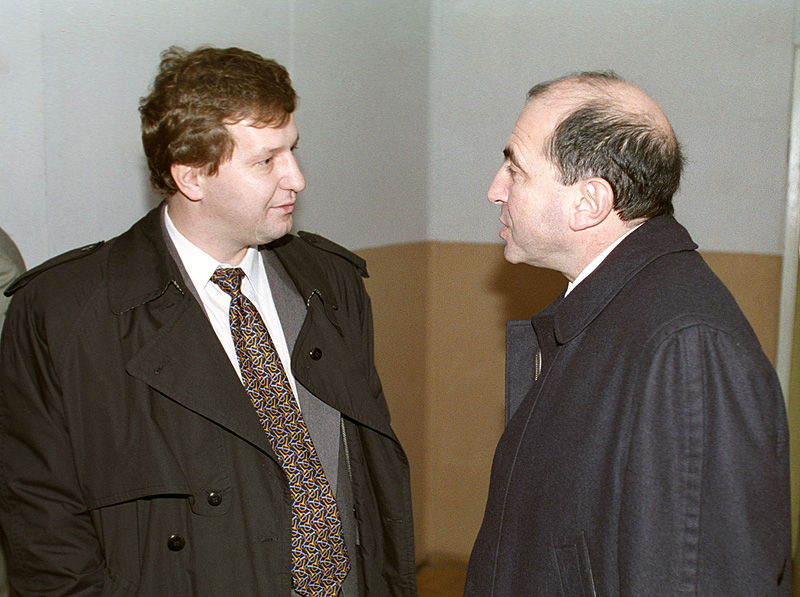 28.10.1994, Россия, Москва. Генеральный директор компании "АвтоВАЗ" Николай Глушков (слева) и генеральный директор АО AVVA ("Автомобильный альянс") Борис Березовский (справа) во время брифинга.