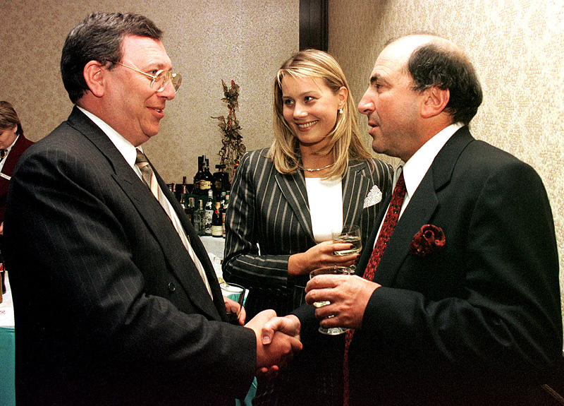 Адвокат Генрих Падва (второй слева), предприниматель Борис Березовский (в центре) и главный редактор газеты "Коммерсант" Андрей Васильев (справа) на праздновании 10-летия газеты "Коммерсант". Торжество состоялось в ресторане гостиницы "Балчуг".