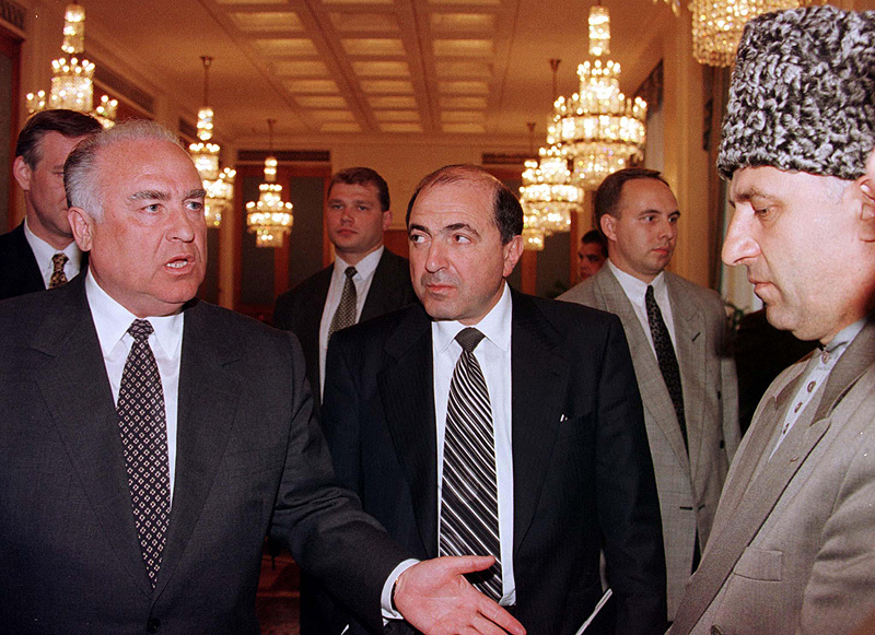 Премьер-министр России Виктор Черномырдин, президент Чеченской республики Аслан Масхадов и Борис Березовский в день подписания Борисом Ельциным и Асланом Масхадовым мирного договора.