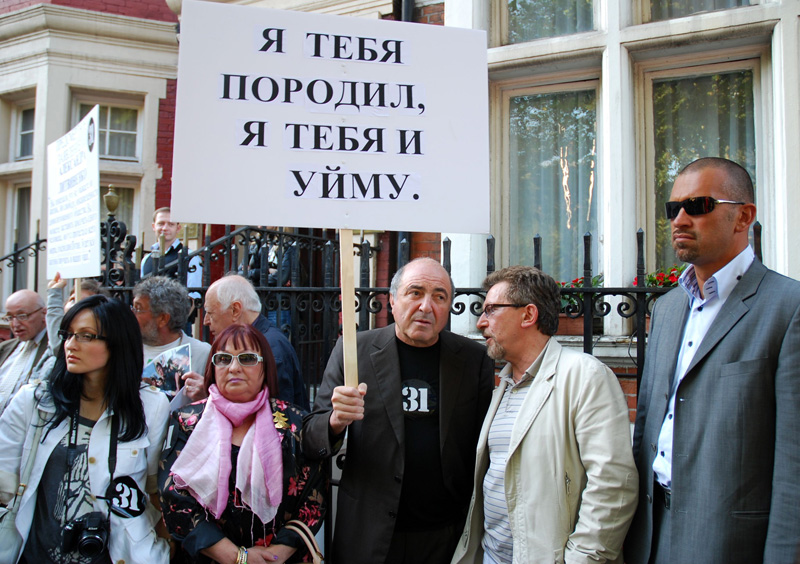 Бизнесмен Борис Березовский (в центре) во время митинга в защиту 31-й статьи Конституции РФ, состоявшегося перед зданием посольства России в Великобритании.