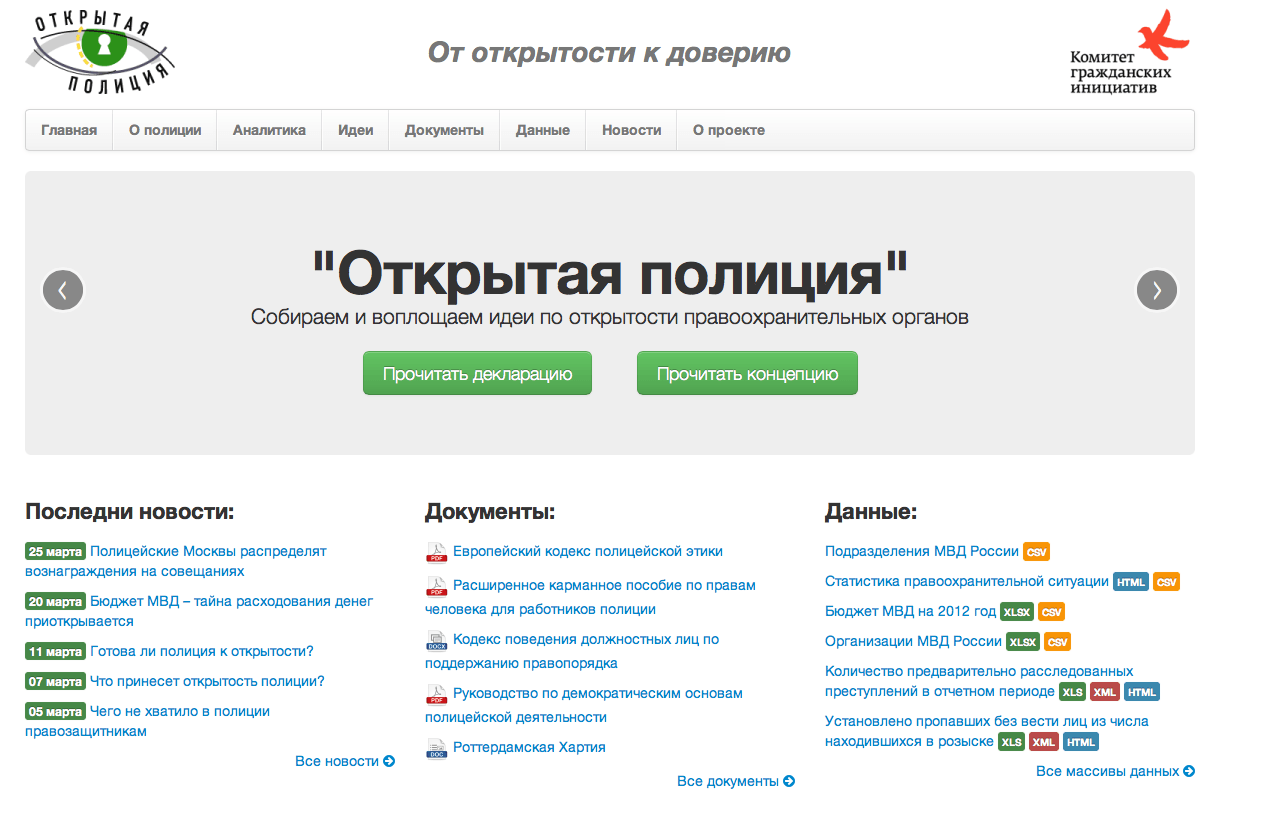 «Открытая полиция» – это проект формата «открытые данные». На площадке собрана и опубликована информация от органов внутренних дел. Авторы проекта делают упор не на рядовых пользователях, а на гражданских активистов. «Открытая полиция» готова делиться данными со СМИ и энтузиастами.