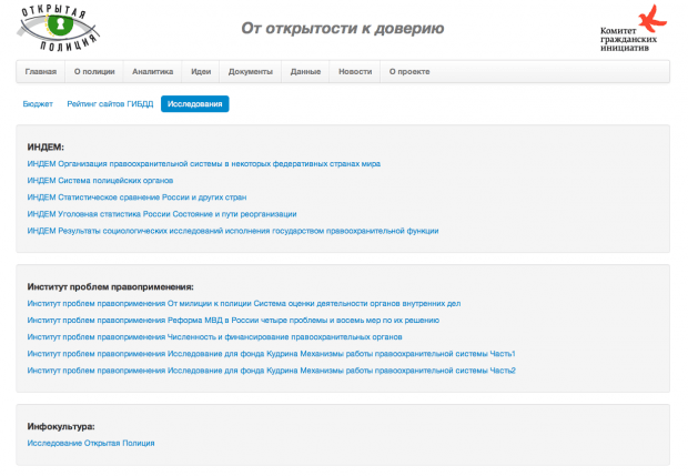 И.Б.: Безусловно. В рамках сайта «Открытой полиции» уже реализовано несколько таких инструментов. Среди них визуализация бюджета, рейтингов сайтов ГИБДД (ресурсы этого ведомства сложны для рейтингования, потому что существуют на общей CMS).