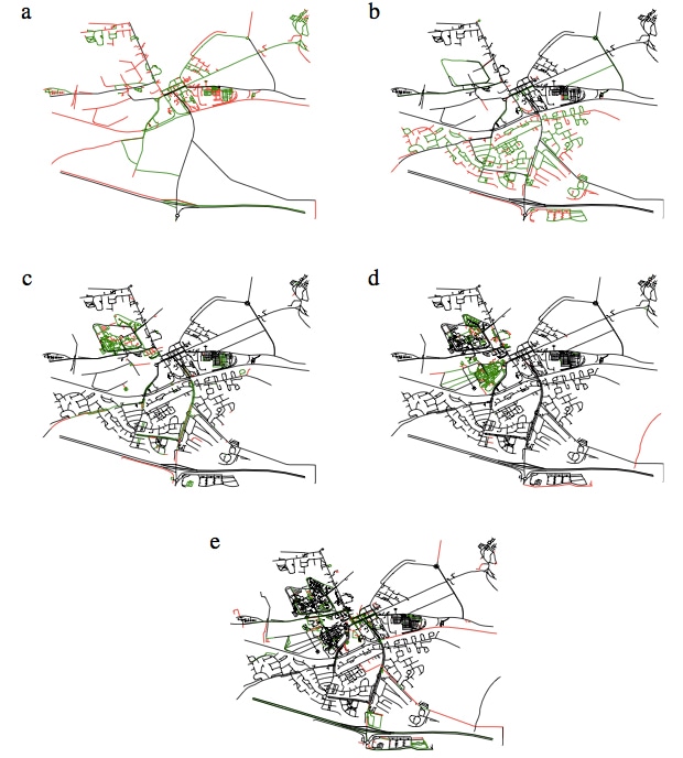На данном изображении из исследования, опубликованного в журнале Spatial Statistics, показан рост сетей OpenStreetMap в трех областях Ирландии. Это дает возможность проследить, как формировались сети. Данное изображение – это полная визуальная история расширения OpenStreetMap в Maynooth, Ireland с января 2007 года по январь 2011 (зеленым показано уплотнение, а красным — расширение карты).
