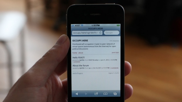 Occupy.here – это анонимная одноранговая (peer-to-peer) виртуальная сеть для открытых политических дискуссий. Любой человек со смартфоном или ноутбуком, находящийся в пределах доступа Occupy.here wifi-роутера, может присоединиться к сети “OCCUPY.HERE”, загрузить локальный веб-сайт occupy.here и использовать простой и удобный форум для связи с другими пользователями.