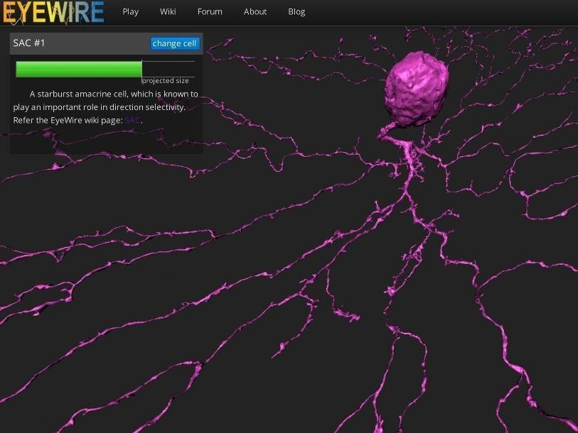 На первом этапе авторы проекта сосредоточились на одном из зрительных нервов, который начинается на сетчатке глаза и отвечает за восприятие движения. Приложение EyeWire предлагает каждому игроку распутать небольшой участок этой головоломки и проследить пути определенных нейронов. Игровой процесс похож на 3D-раскраску. Компьютер предлагает кубический фрагмент мозга и помечает начало одной из нейронных ветвей, а игроку необходимо найти и пометить недостающие части. При этом специальная программа анализирует действия людей и учится принимать верные решения.